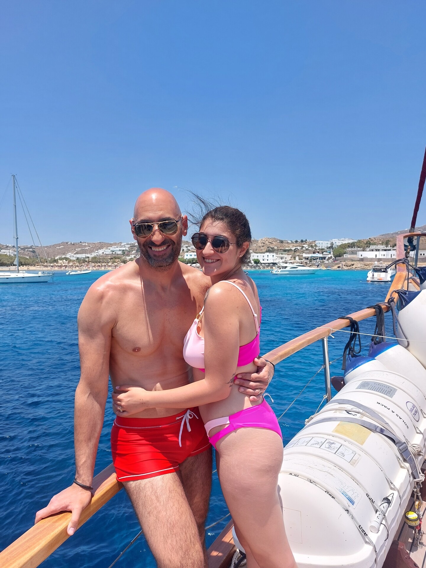 “The picture I shared is before the double disaster. We were on a boat trip in Mykonos, sitting at the front. Thirty minutes in, the unimaginable happened. I wanted to swim, so I put my wedding ring and proposal diamond in the sunglasses case, thinking they would be safe there. When we started moving, the wind was really strong, so my husband tried to take the rings out and we heard a noise – the rings fell and we couldn’t find them. We started searching with the whole tour group; there were Spanish, Australian, French, British, and Italian people all looking for my rings! We finally found them, but the wind had taken my husband’s flip flops and thrown them to the sea, so he remained without shoes for the rest of the afternoon.”