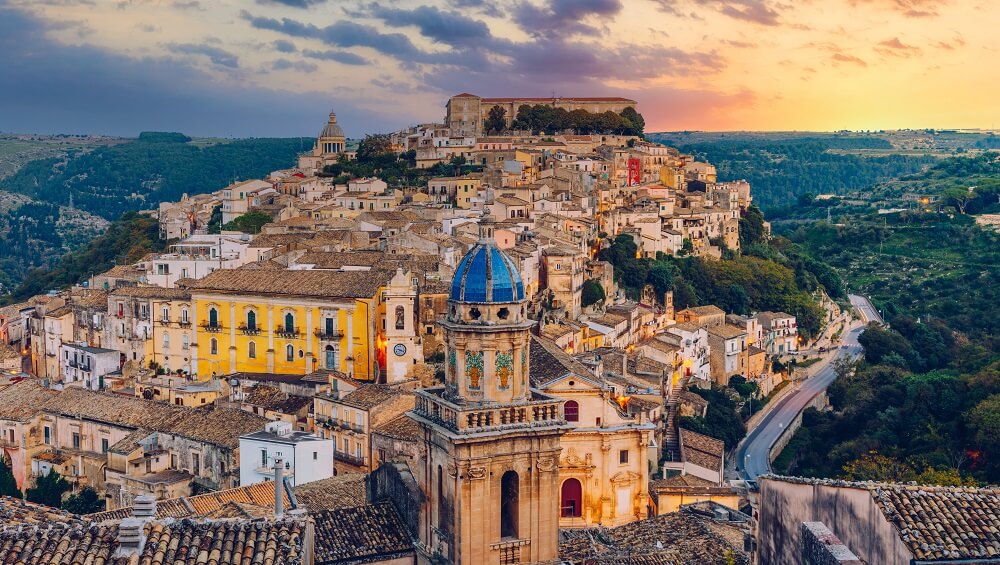 Inland from Noto, Ragusa boasts equally gorgeous Baroque architecture but with a more romantic and organic, lived-in feel. The town is spread across various hills, with winding streets, terraces, gardens, and honey-coloured limestone buildings.